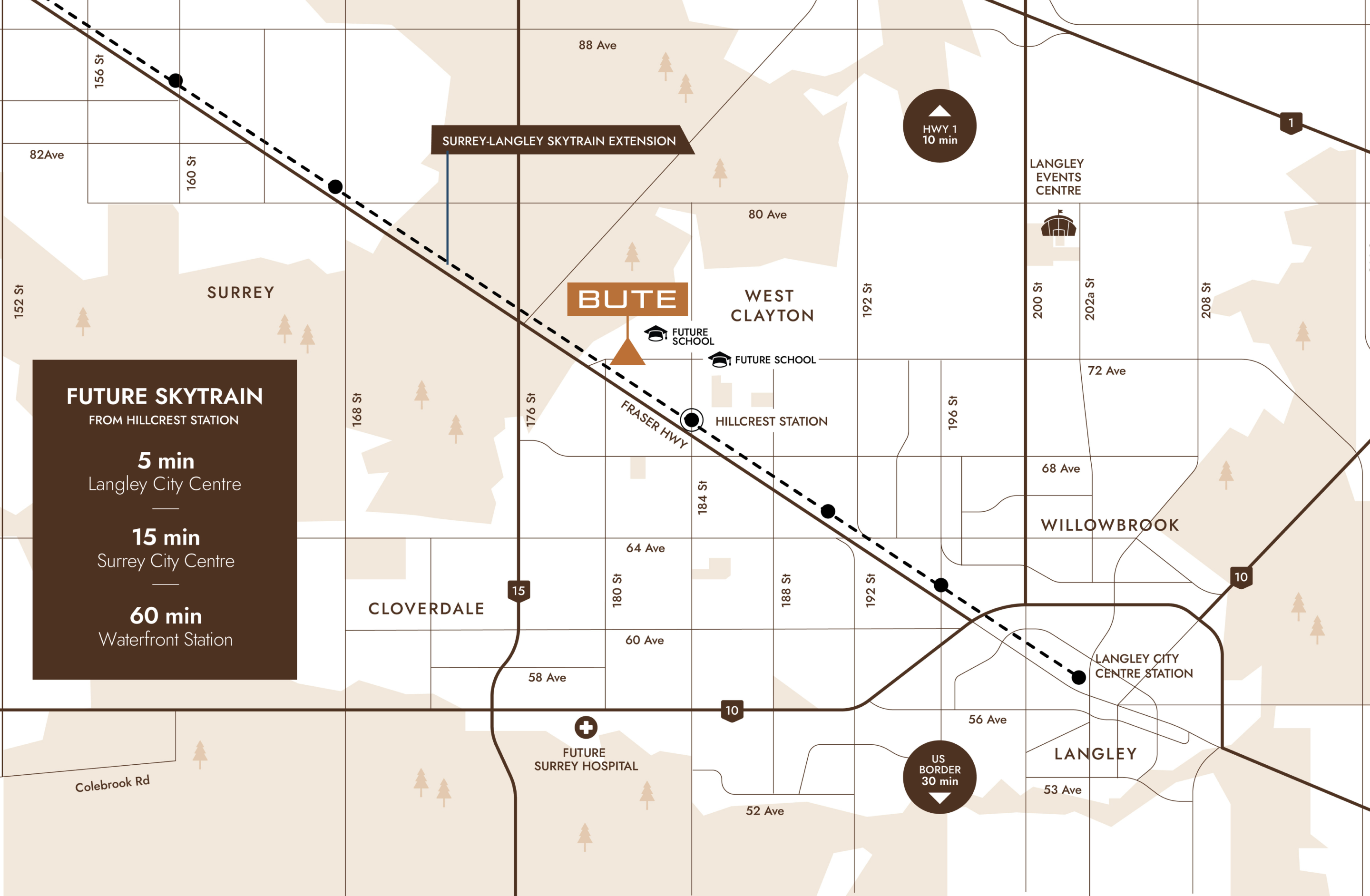 The first phase of Clayton Crest is underway. Atlin was just the beginning, and now Bute carries the vision forward — your chance to invest early in a community where the future is taking shape. Just a 5-minute walk from the future SkyTrain station, you'll enjoy seamless access to downtown Vancouver while embracing the serene beauty of the Fraser Valley.